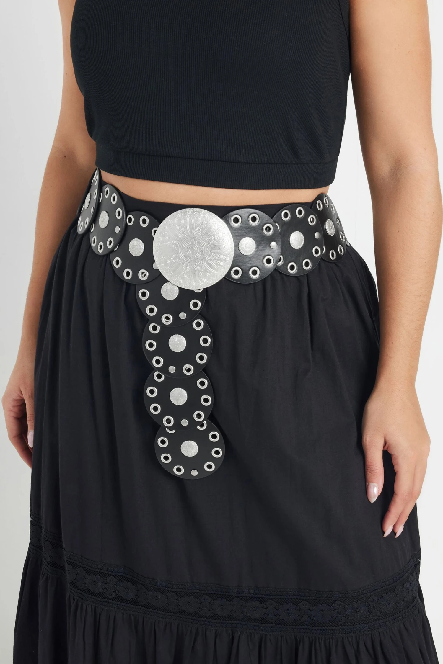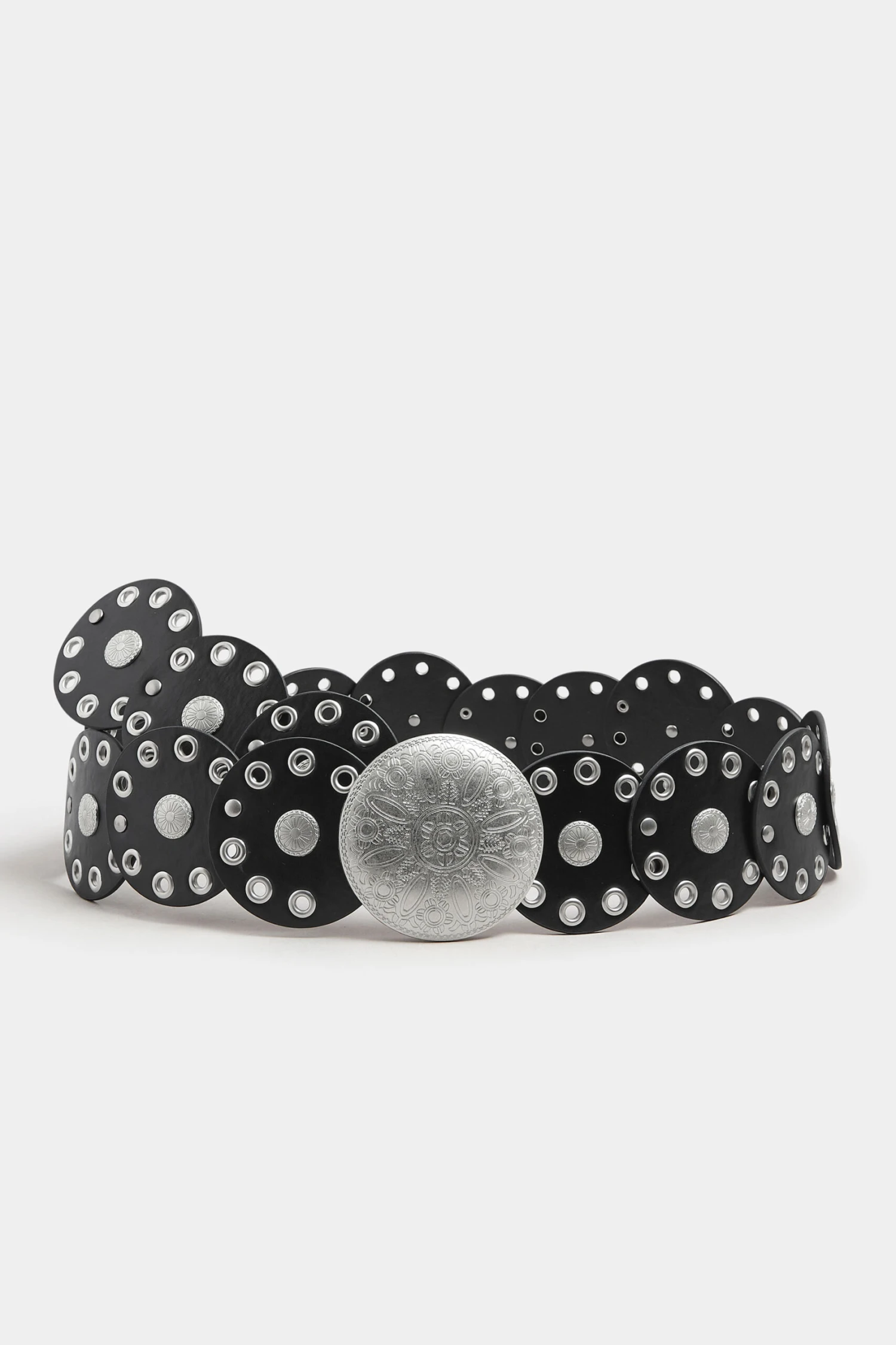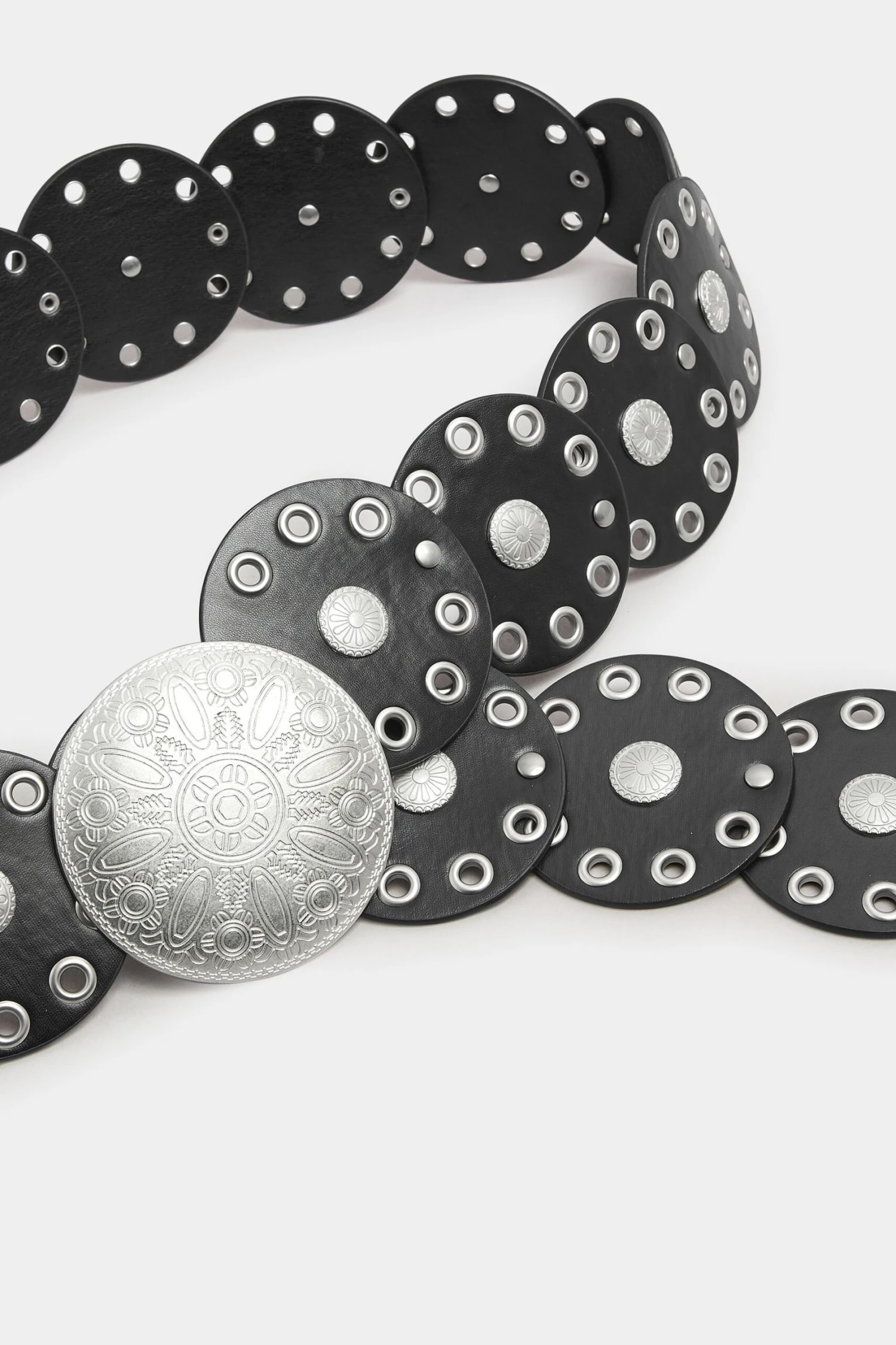 Complétez vos looks favoris de saison avec notre ceinture noire large disques cloutés.