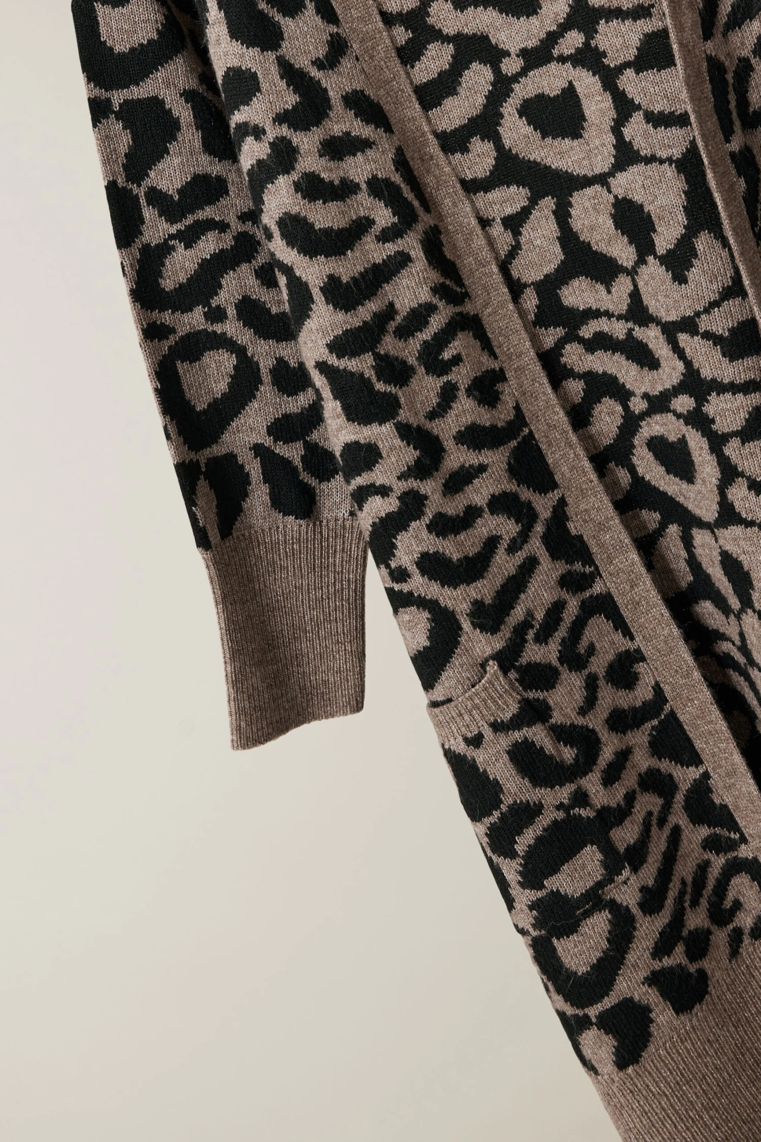 Leopard printLong sleevesOpen front designMade from a comfortable knitted fabric68% acrylic, 32% recycled polyesterLength from (approx): 97cm/38.2″Machine washableMade In BangladeshLe mannequin mesure 5’10.5″/178cm et porte du UK 16/EU 44