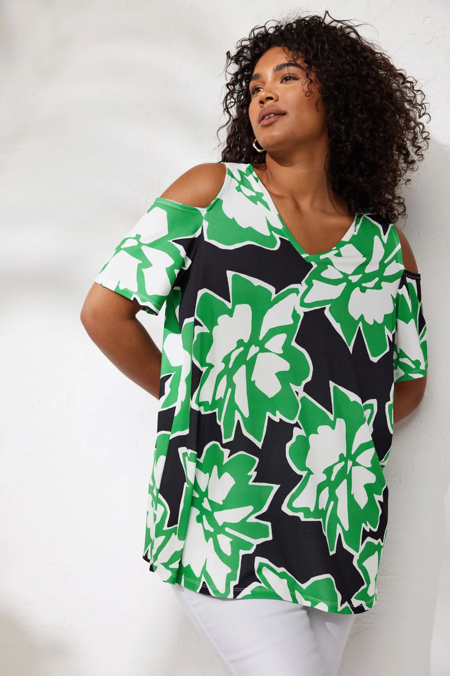 Add this summertime staple to your wardrobe! Made from a soft jersey fabric, this top is lightweight and stretchy. It features a cold shoulder style, short sleeves and a v-neckline. Partner with jeans or shorts to wear whatever the weather!