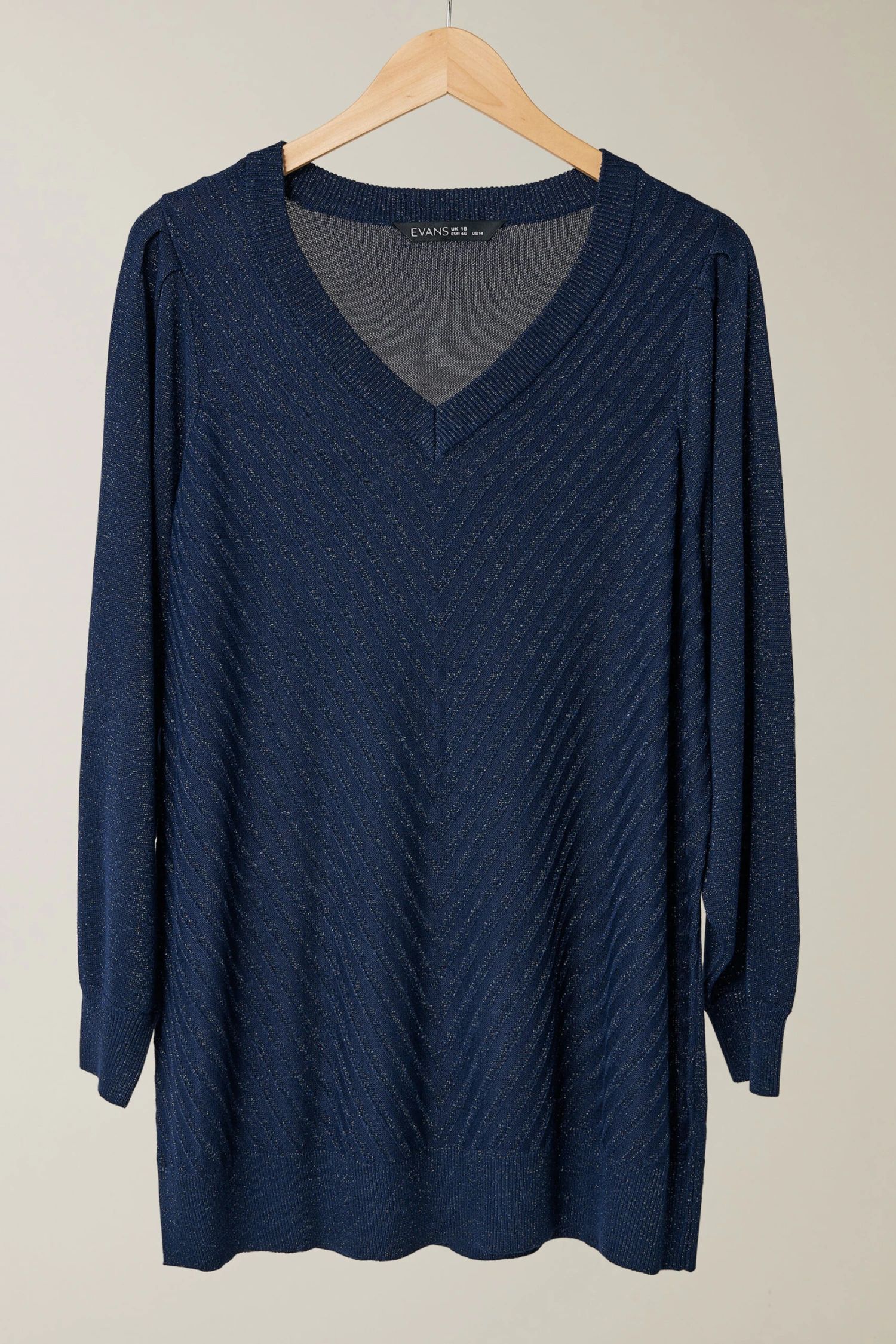 Chevron designMetallic detailingLong sleevesV-necklineMade from a comfortable knitted fabric80% viscose, 20% metallised fibreLength from (approx): 80cm/31.5″Machine washableMade In BangladeshLe mannequin mesure 5’10.5″/178cm et porte du UK 16/EU 44