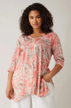 Give your casual collection a refresh with this flattering top. Cut from a lightweight jersey fabric, this top is luxuriously soft and breathable. It features a tropical print, a hanky hemline, a pleat front design and 3/4 length sleeves. Wear with jeans and sandals for an everyday look you’ll love.