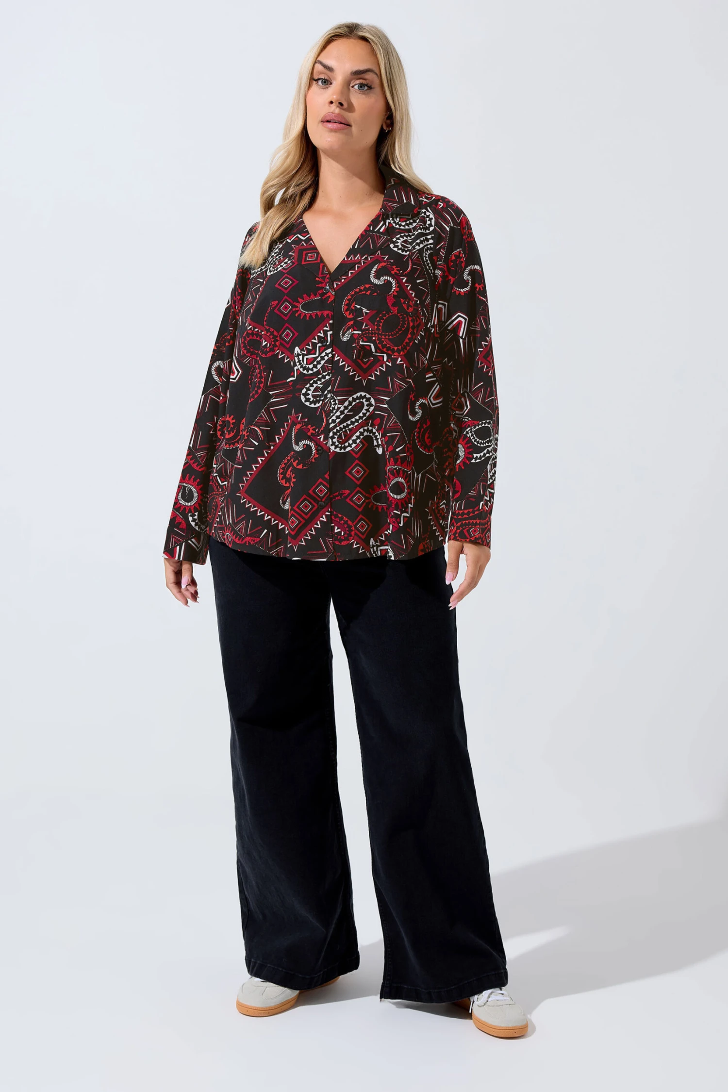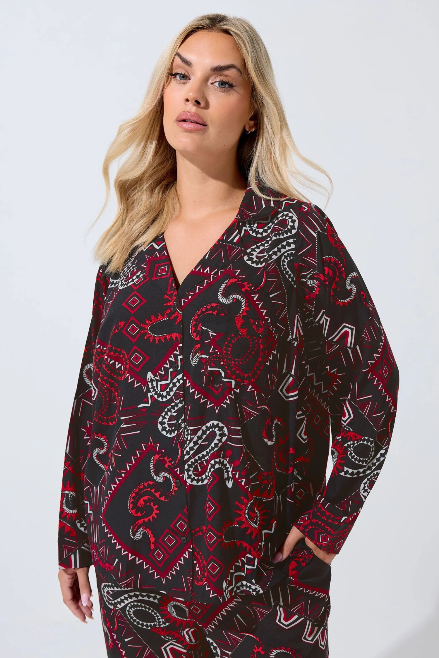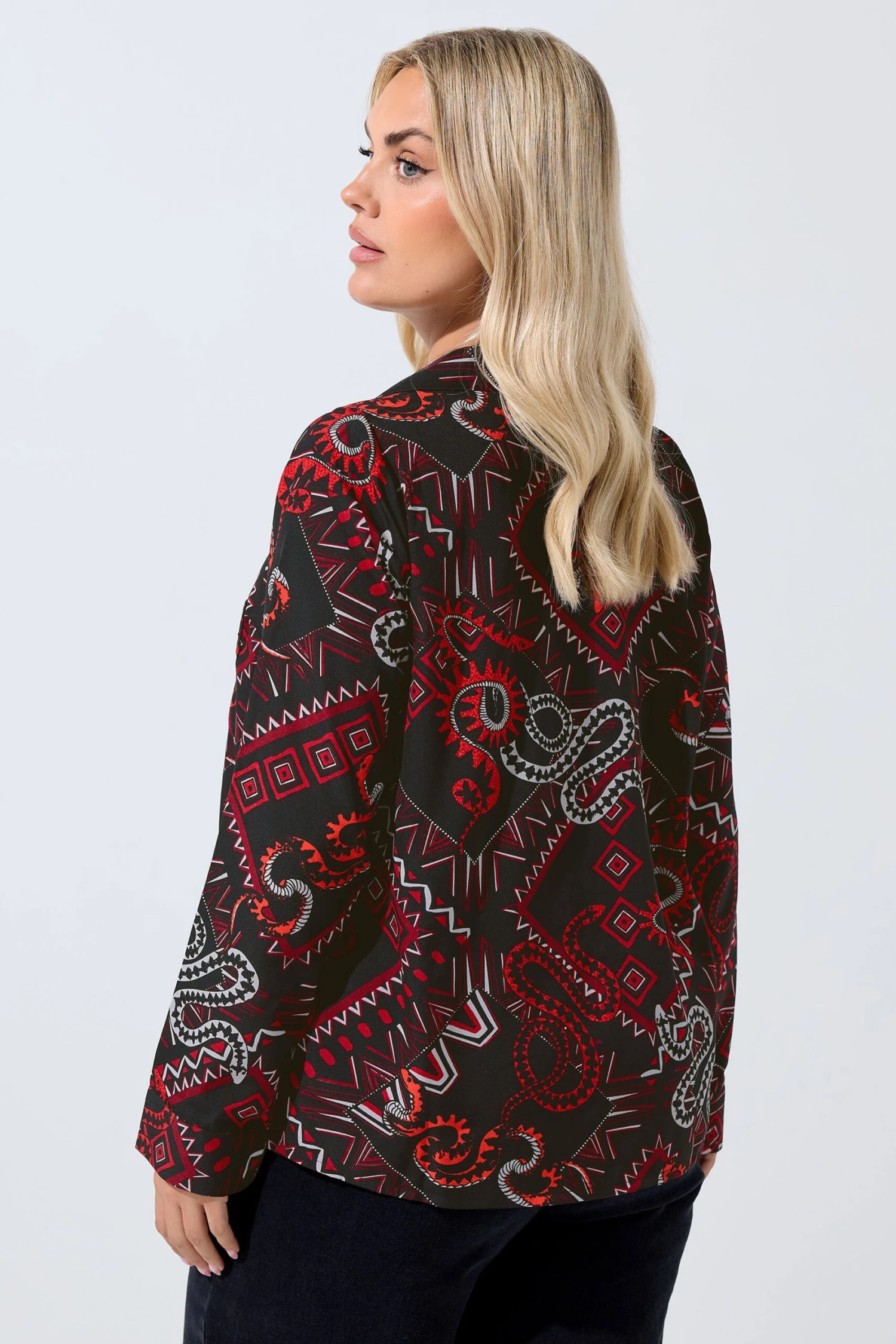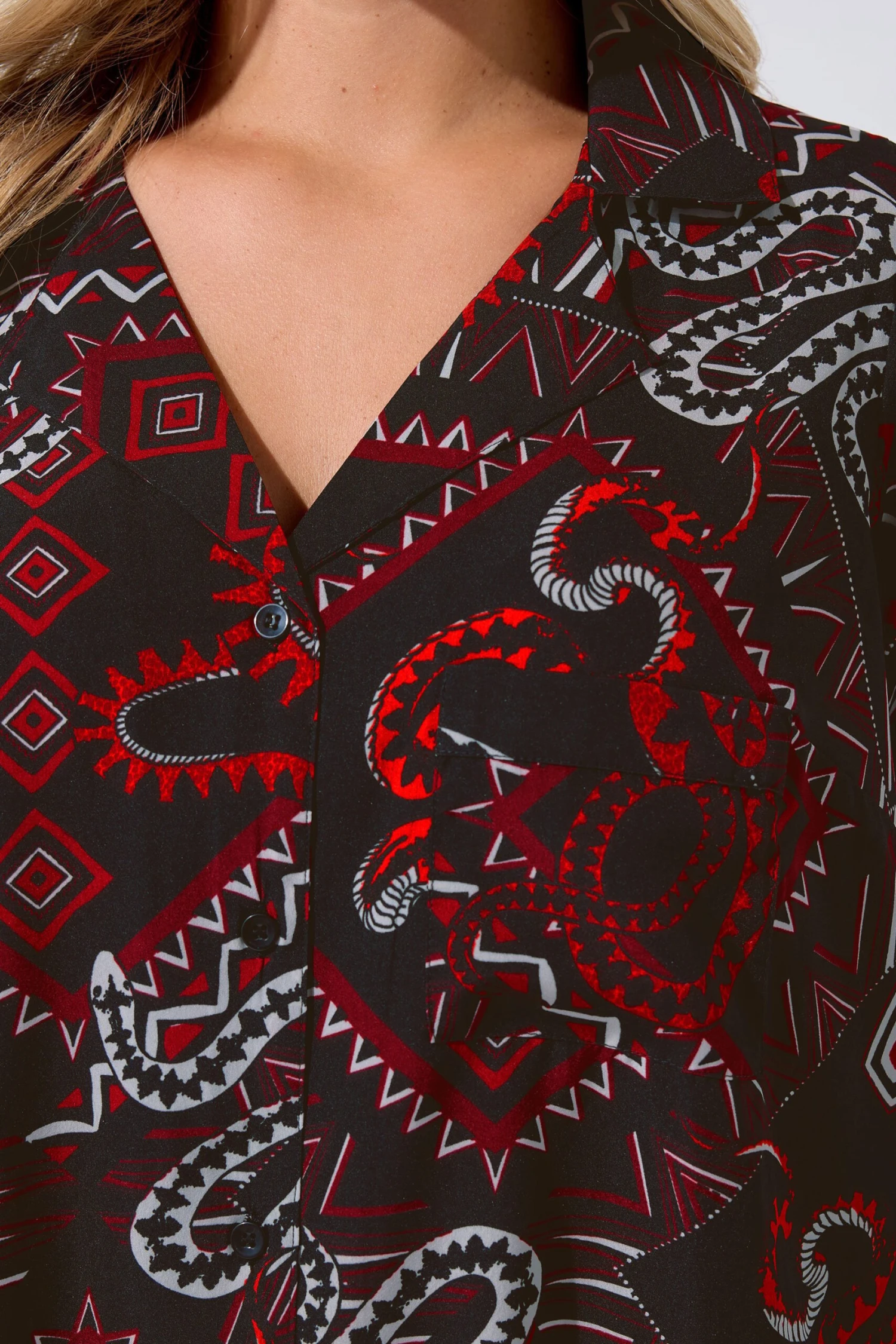 Complétez vos tenues favorites de saison en y ajoutant du caractère avec notre chemisier noir et rouge design aztèque.