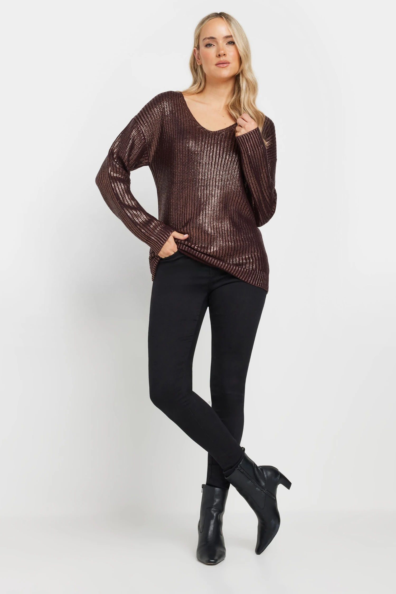Refresh your knitwear for the approaching party season with this foiled jumper. Made from a soft knit fabric, it features a v-neckline and long sleeves. Pair with a darker denim and boots for an ideal date night outfit!