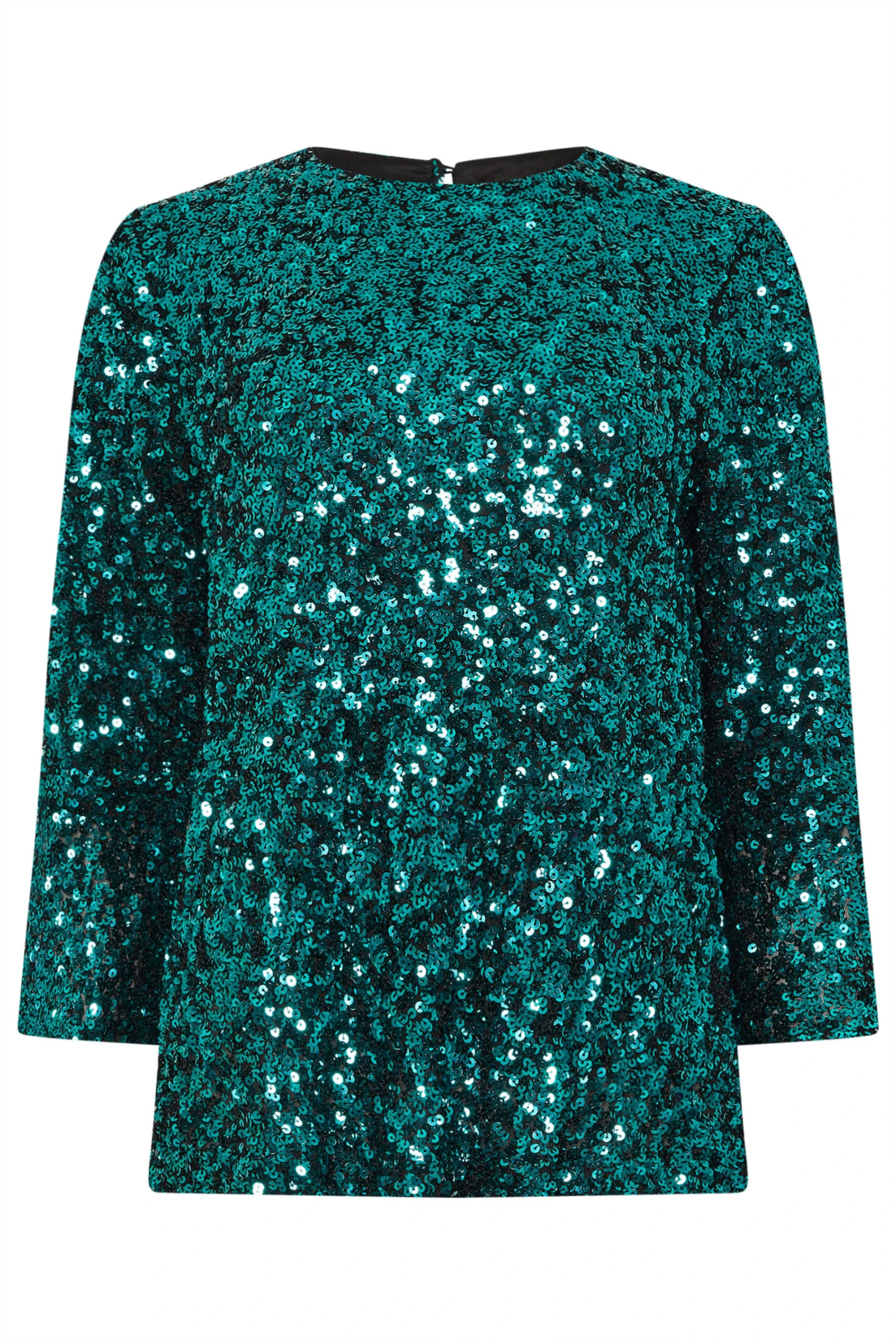 Refresh your party collection with this new-in sequin top. Made from a comfortable woven fabric, it features long flute style sleeves, a scoop neckline and back keyhole with value fastening, finished with a sequin embellishment, perfect to make a statement. Pair with skinny jeans and heels for an effortless party outfit.