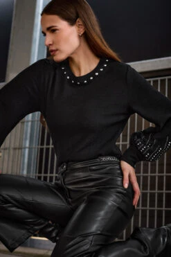 Level your new knits with this intricate studded jumper. Curated from a soft knit fabric, it features a crew neckline, long ballooned sleeves and is composed with stud detailing. Perfectly pair with faux leather trousers for a refined style you can reach for all throughout these colder months!