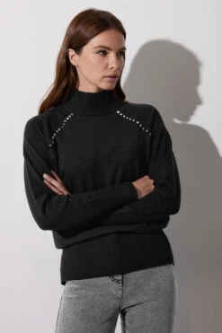 Add a style statement to casual occasions with this embellished jumper. Crafted from a soft knitted fabric, it features a rollneck with raglan style sleeves and stud embellishment. Compose the full outfit with jeans and heeled boots.