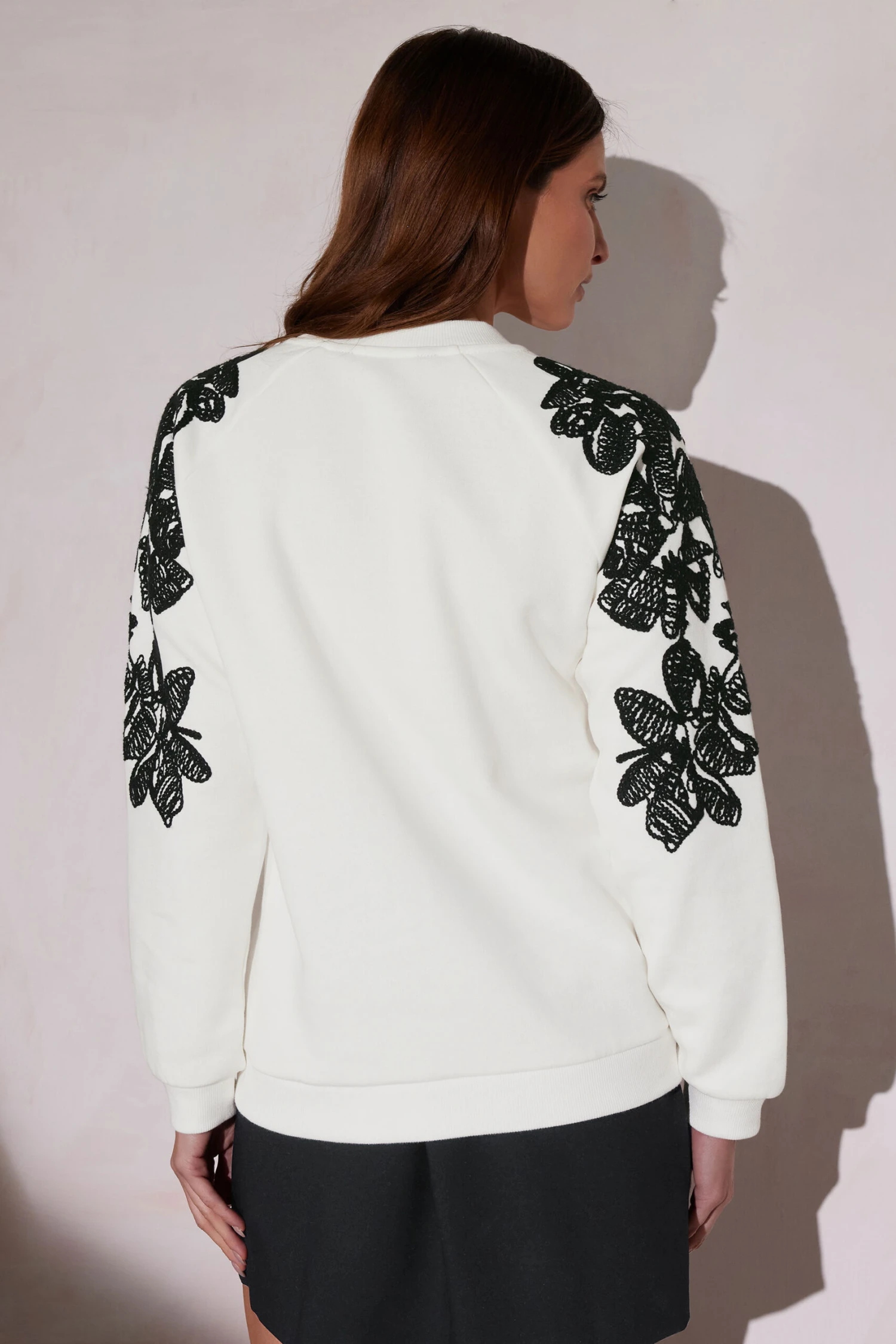 Make a statement in your sweats with this embroidered sweatshirt. Crafted from a soft cotton fabric, it is composed with a classic crew neckline and is complete with a floral embroidered design on both sleeves. Style with your go-to boyfriend jeans for a flexible daytime elegance or dress up your more casual occasions and wear it with a wrap skirt!