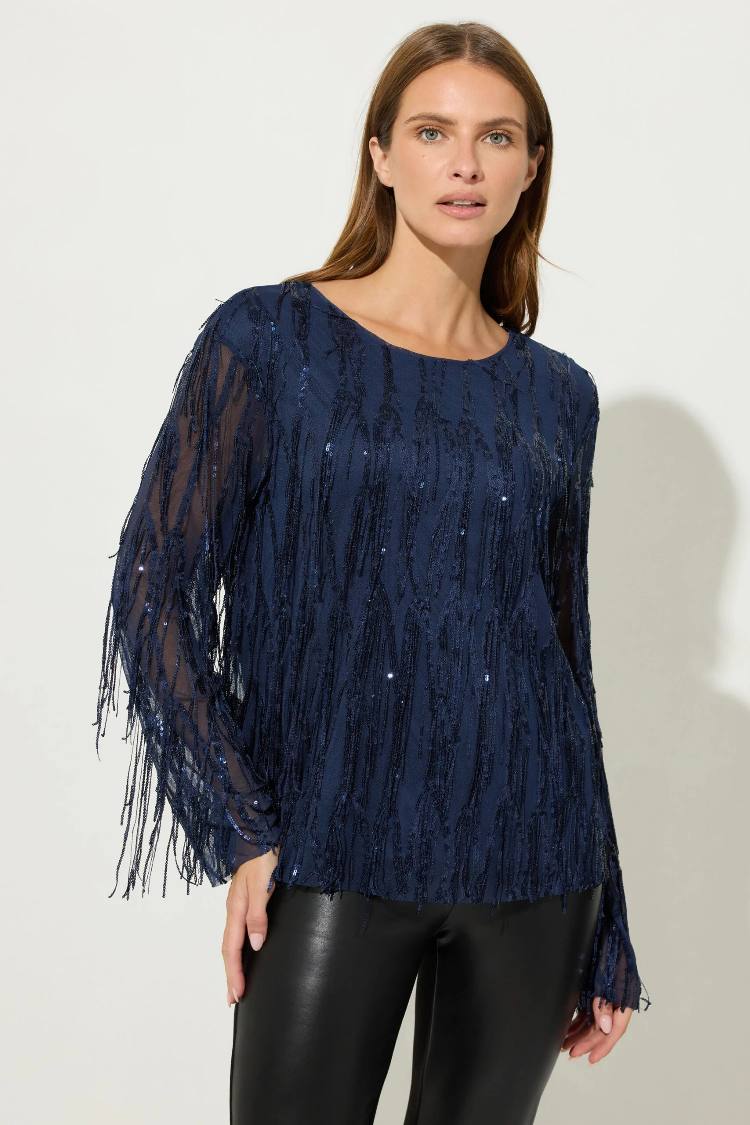 Strike an unforgettable style in this sequin embellished top. Crafted from a soft jersey fabric, it features a scoop neckline, mesh long sleeves and is finished with tassel details. Compose your ensemble with the addition of denim and heels.