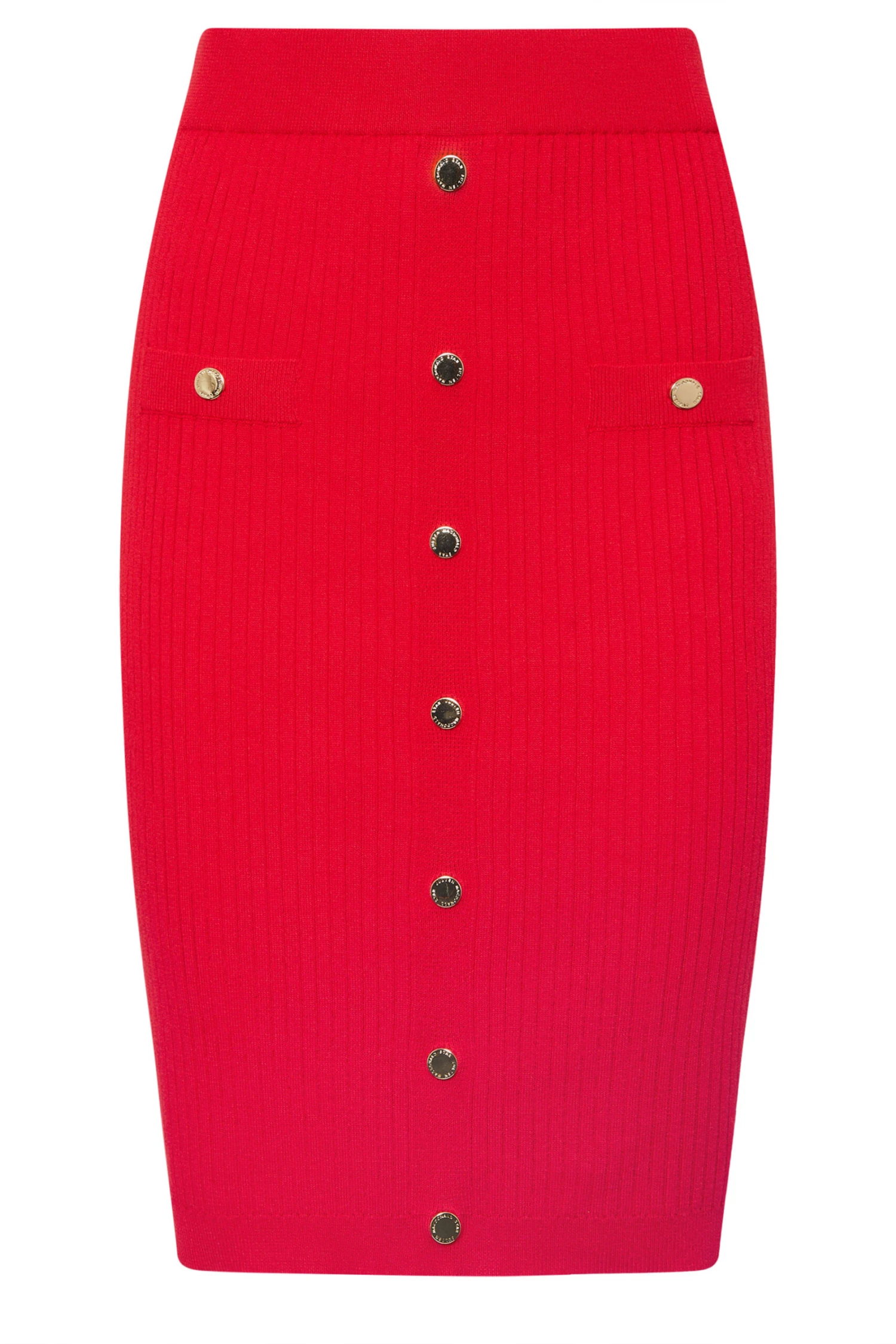 Rework your office outfits with this ribbed midi skirt. Crafted from a soft knit fabric, it features front branded value detailing and an elasticated waistband while completing in a bodycon style. Compose with the coordinating knitted cardigan and heels for a workwear co-ord suited for this season and beyond!