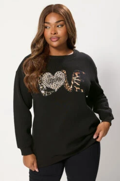 Slogan « Love »Imprimé léopardOrnements à paillettesManches longuesEncolure ras du couPoignets et ourlet côtelésFabriqué en jersey confortable50 % viscose, 40 % polyester, 7 % coton, 3 % acryliqueLavable en machineMade In TurquieLe mannequin mesure 5′ 8.5″/ 174cm et porte du UK 18/EU 46