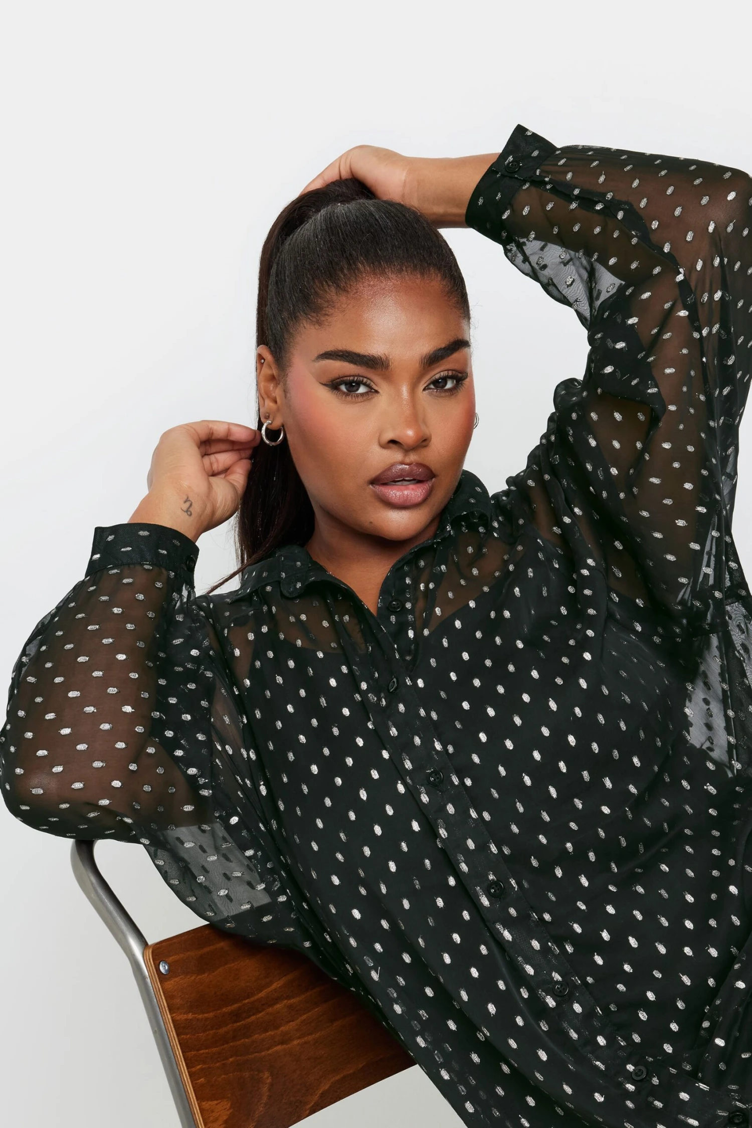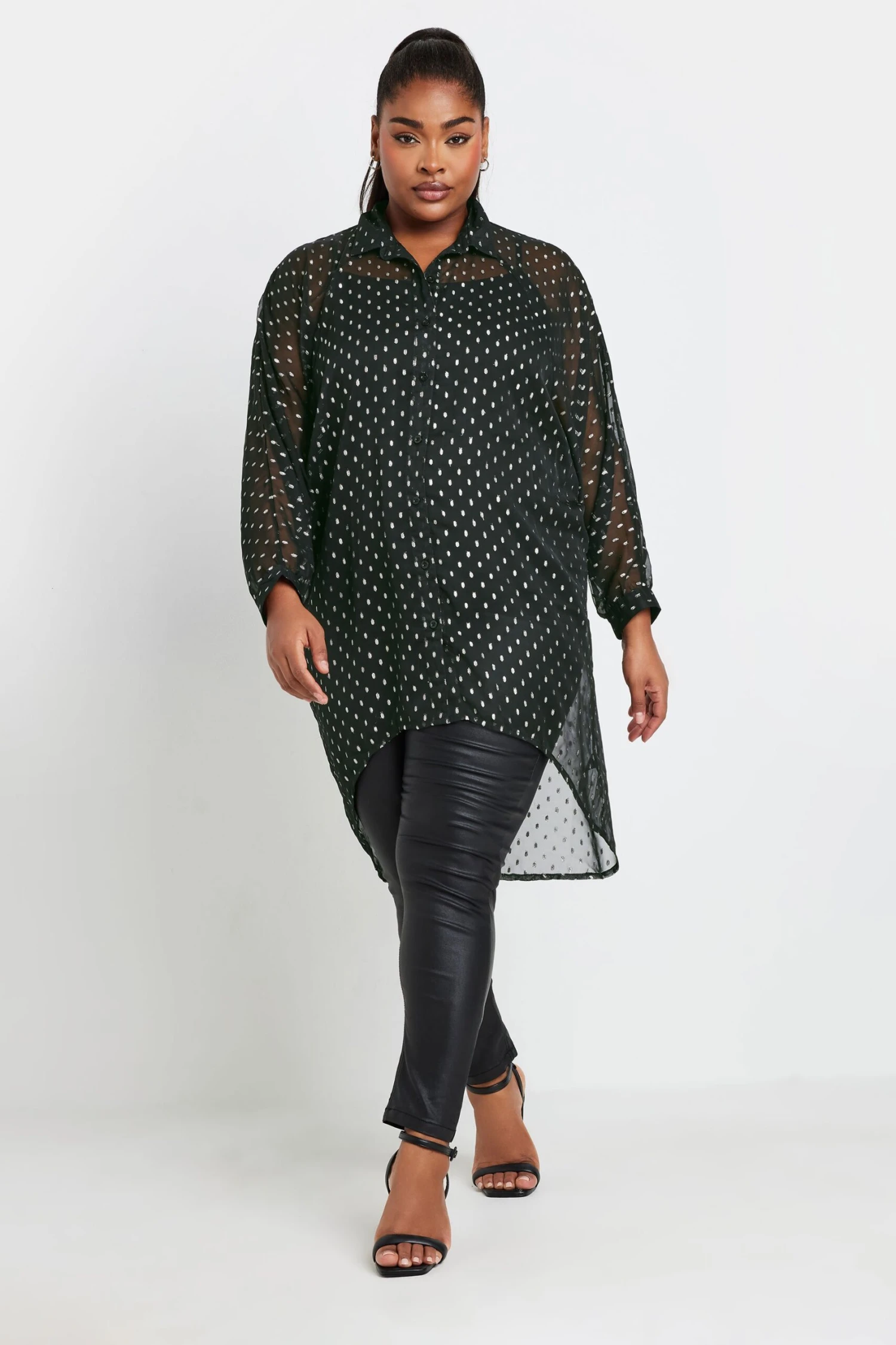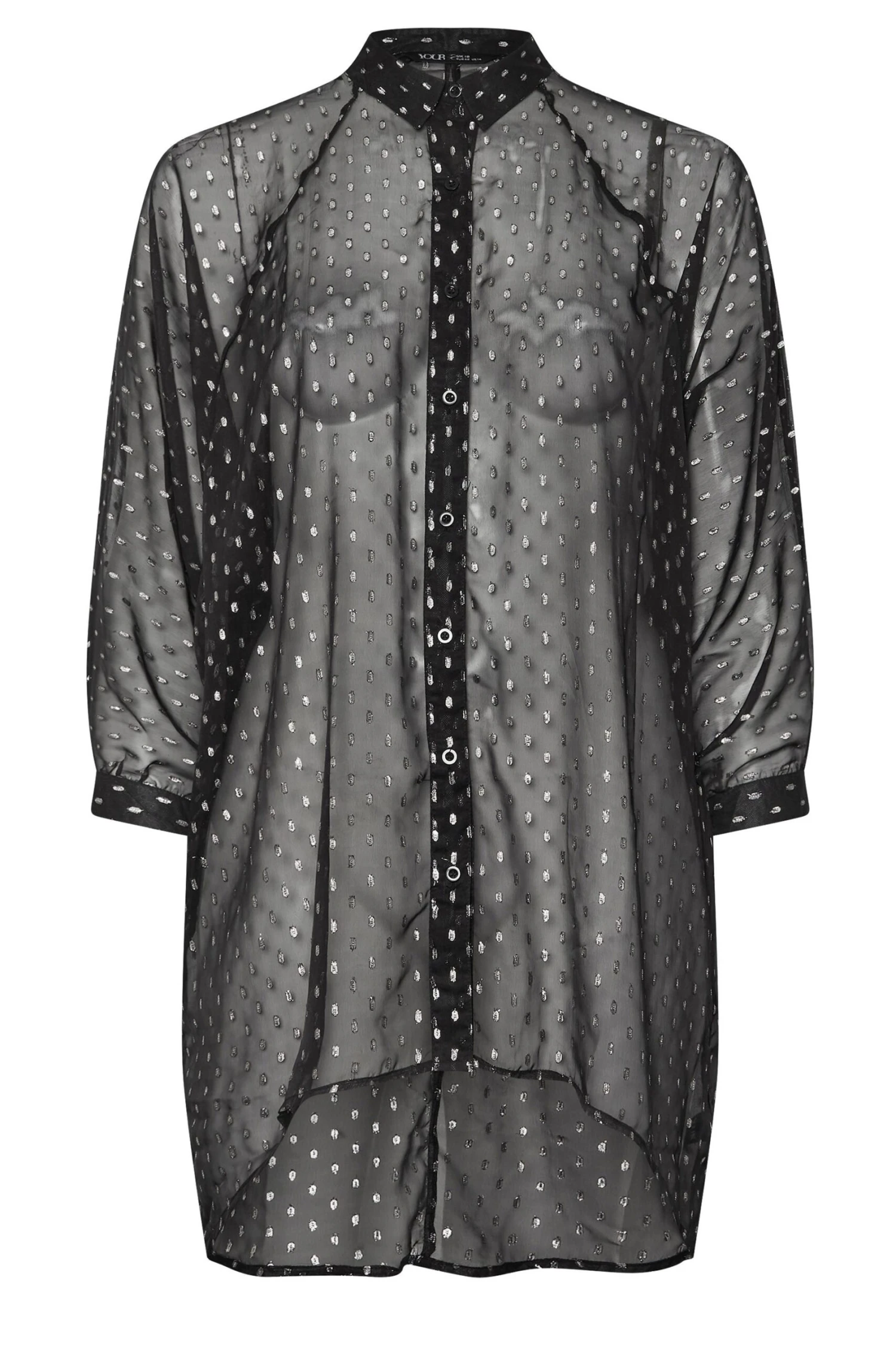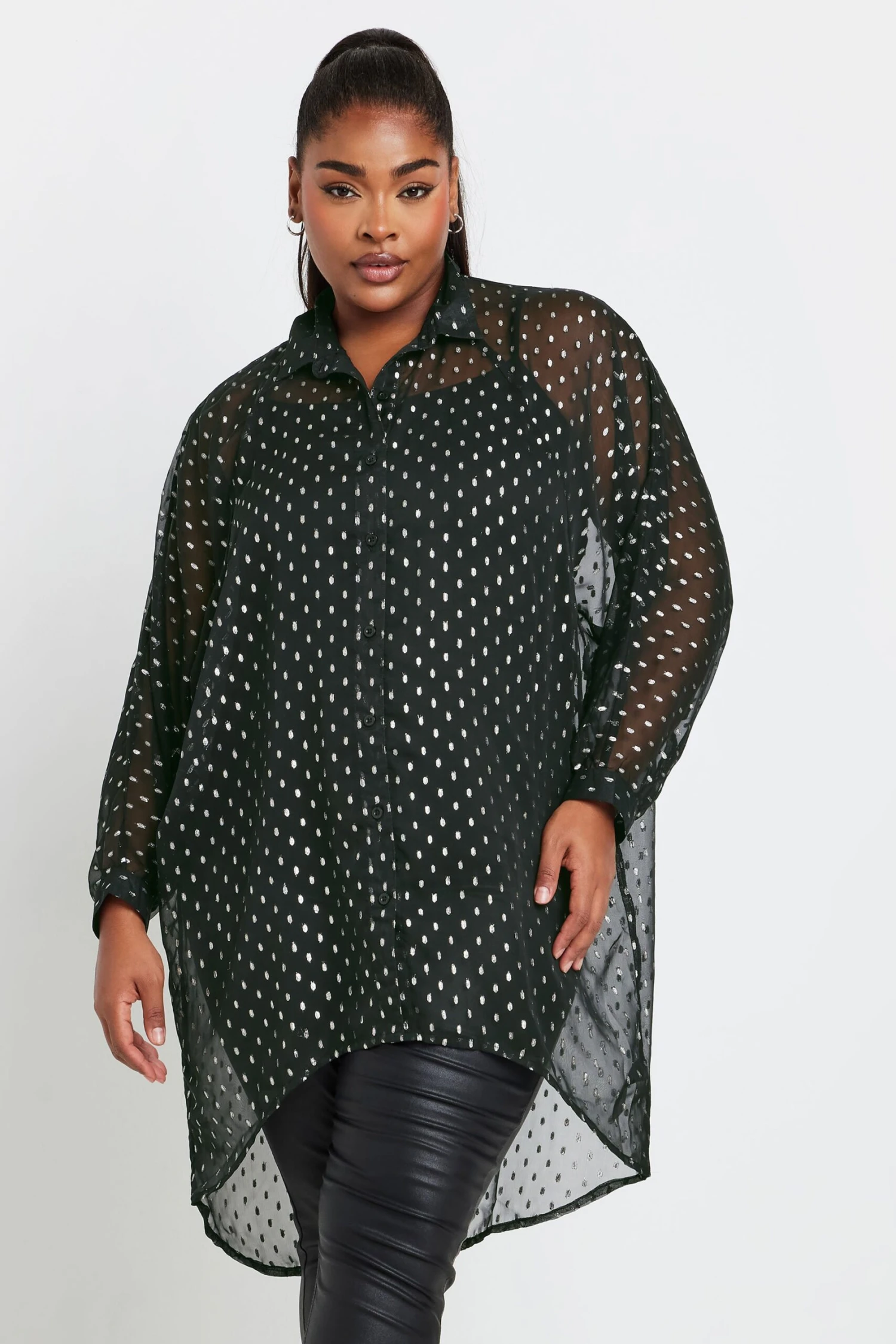 Complétez vos looks classes de saison avec notre chemisier noir design à pois ourlet plongeant. Féminin et raffiné, vous allez adorer le porter pour vos sorties de saison.