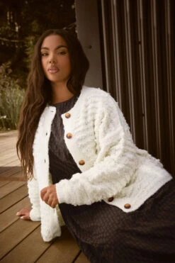 Modèle en maille épaisseFermeture boutonnéeManches longuesEncolure rondeFabriqué en maille bouclée douce65 % acrylique, 15 % polyamide, 20 % polyesterLongueur à partir de (environ) : 66 cm/25,9 poLavable en machineMade In BangladeshLe mannequin mesure 5′ 8.5″/ 174cm et porte du UK 18/EU 46
