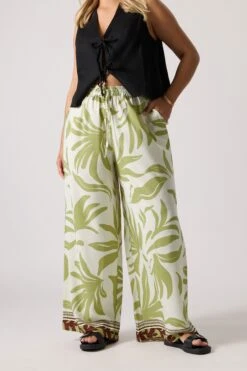 Préparez-vous pour la nouvelle saison avec style grâce à ce pantalon incontournable. Confectionné dans un tissu tissé confortable, il présente un imprimé feuilles avec des bordures et une taille élastiquée avec un lien à nouer. Associez-le à un débardeur caraco et des sandales pour un look parfait pour une journée au soleil ou vos prochaines vacances.
