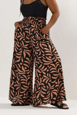 Imprimé feuilles de palmierCeinture élastiquée froncéeStyle jambe largeDeux poches latéralesTaille hauteFabriqué dans un tissu tissé respirant100 % polyesterDimensions des coutures intérieures : 70 cm/27,5″Lavable en machineMade In IndeLe mannequin mesure 5’7″/173 cm et porte du UK 16 / EU 44