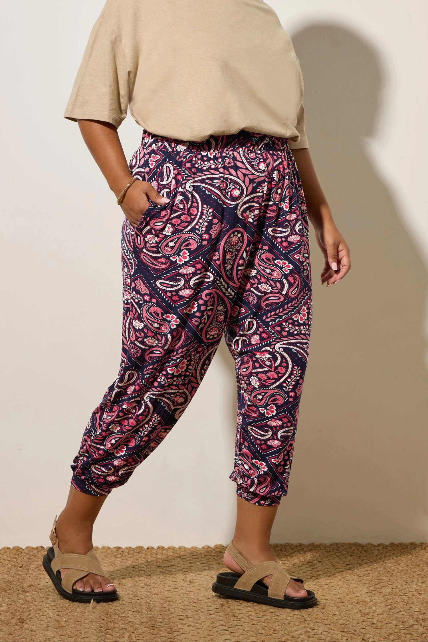 Ce nouveau pantalon style sarouel à imprimé cachemire est parfait pour les journées décontractées. Confectionné dans un tissu tissé confortable, il est doté d’une taille et de poignets élastiqués. Portez-le avec un t-shirt et des baskets pour une tenue décontractée et confortable.