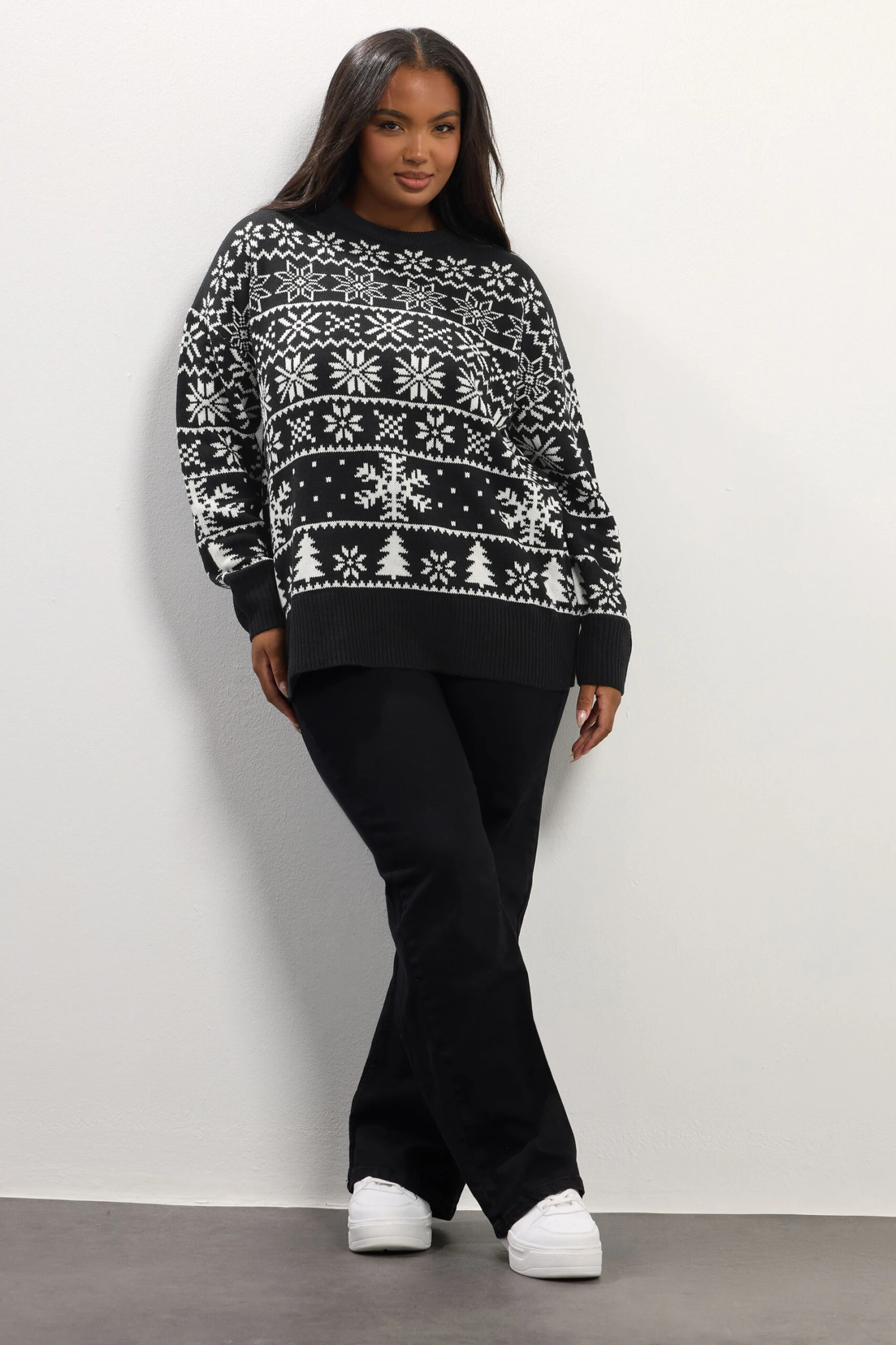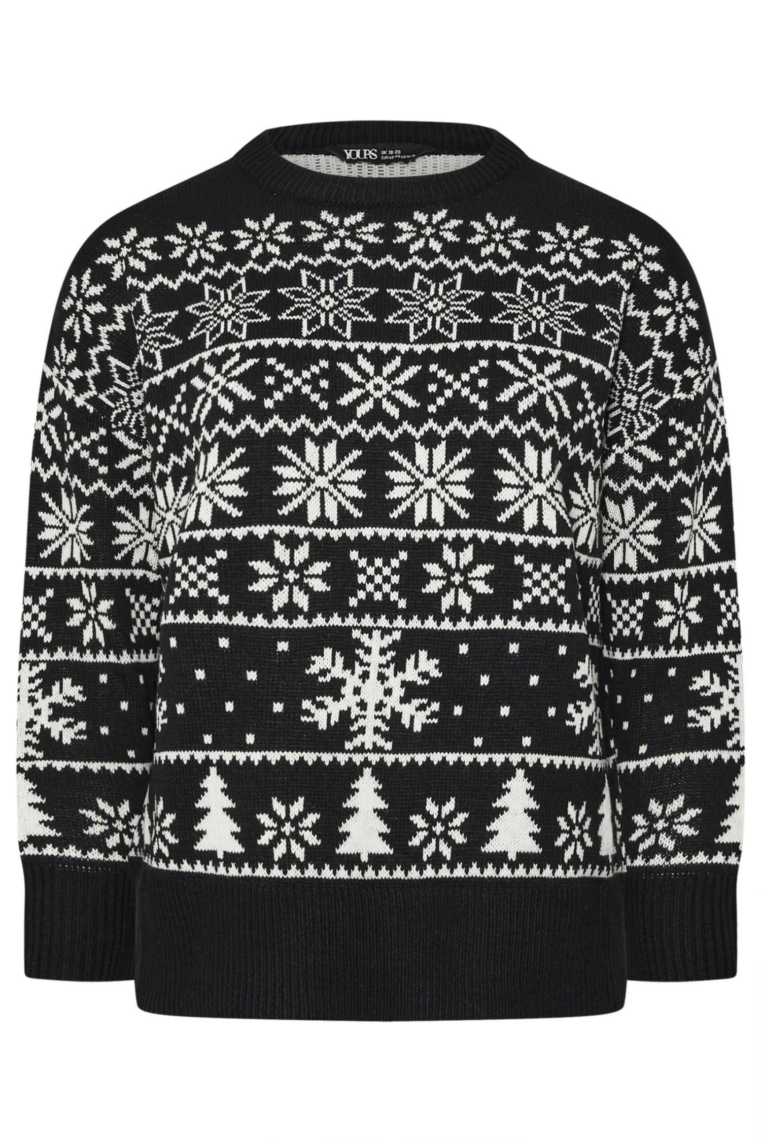 Motif jacquard flocon de neigeManches longuesEncolure ras du couFabriqué en tricot doux100 % acryliqueLavable en machineMade In BangladeshLe mannequin mesure 5’7″/173 cm et porte du UK 16 / EU 44