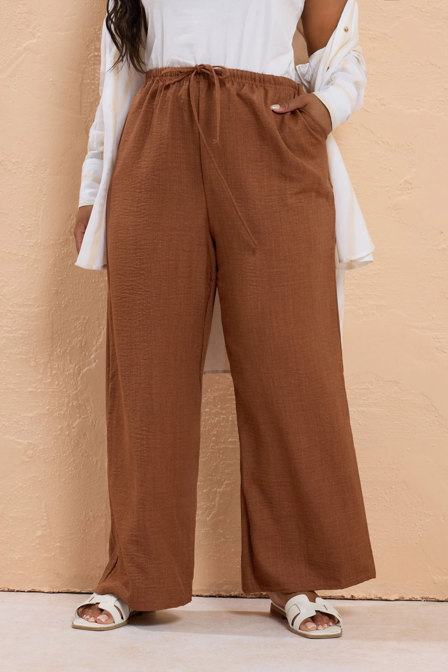 Complétez vos looks favoris de saison avec notre pantalon wide leg rouille plissé en lin. Féminin et léger, vous allez l’adorer.