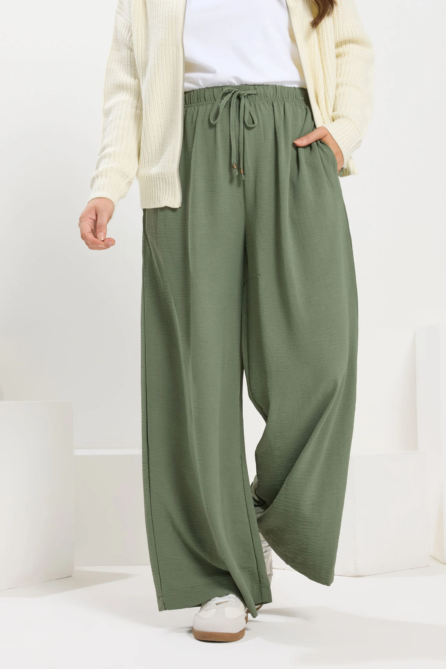 Craquez pour notre pantalon wide leg vert kaki en sergé à poches. Confortable, léger et classe, vous allez adorer le porter pour vos différentes occasions.