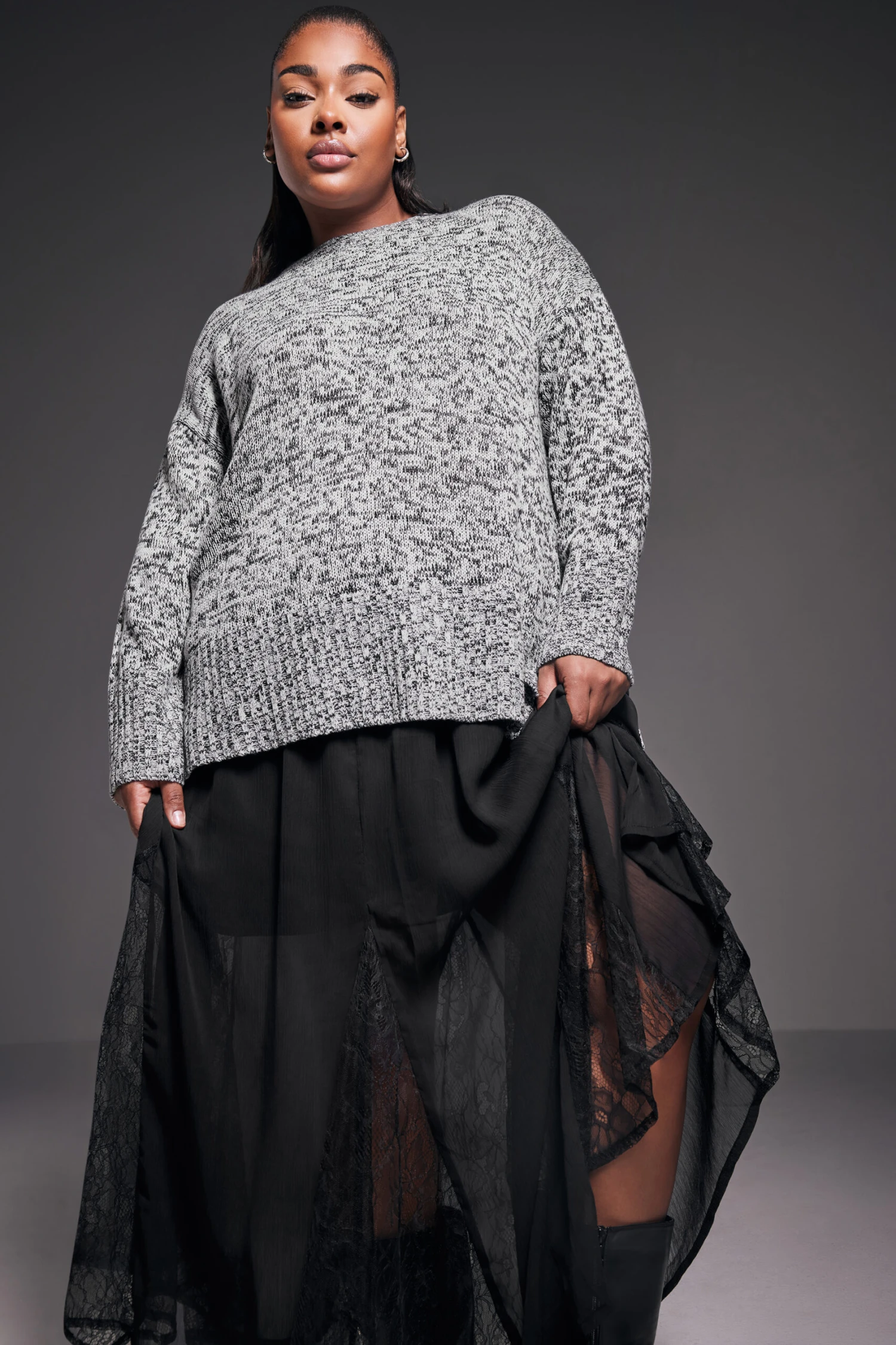 Restez cosy cette saison avec notre pull en maille gris manches longues. Tendance et féminin, vous allez adorer le porter cette saison.